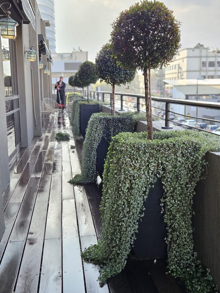 Su un edificio di otto piani, circondato dal mare su tre lati, è stato progettato un tetto giardino con alberi e arbusti capaci di resistere a: